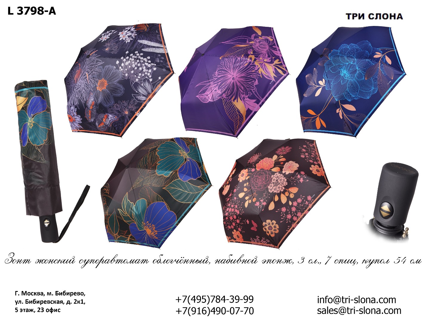 Зонт 3 сложения, Суперавтомат, женский, облегченный, "ЭПОНЖ", 7 спиц, радиус купола - 54 см