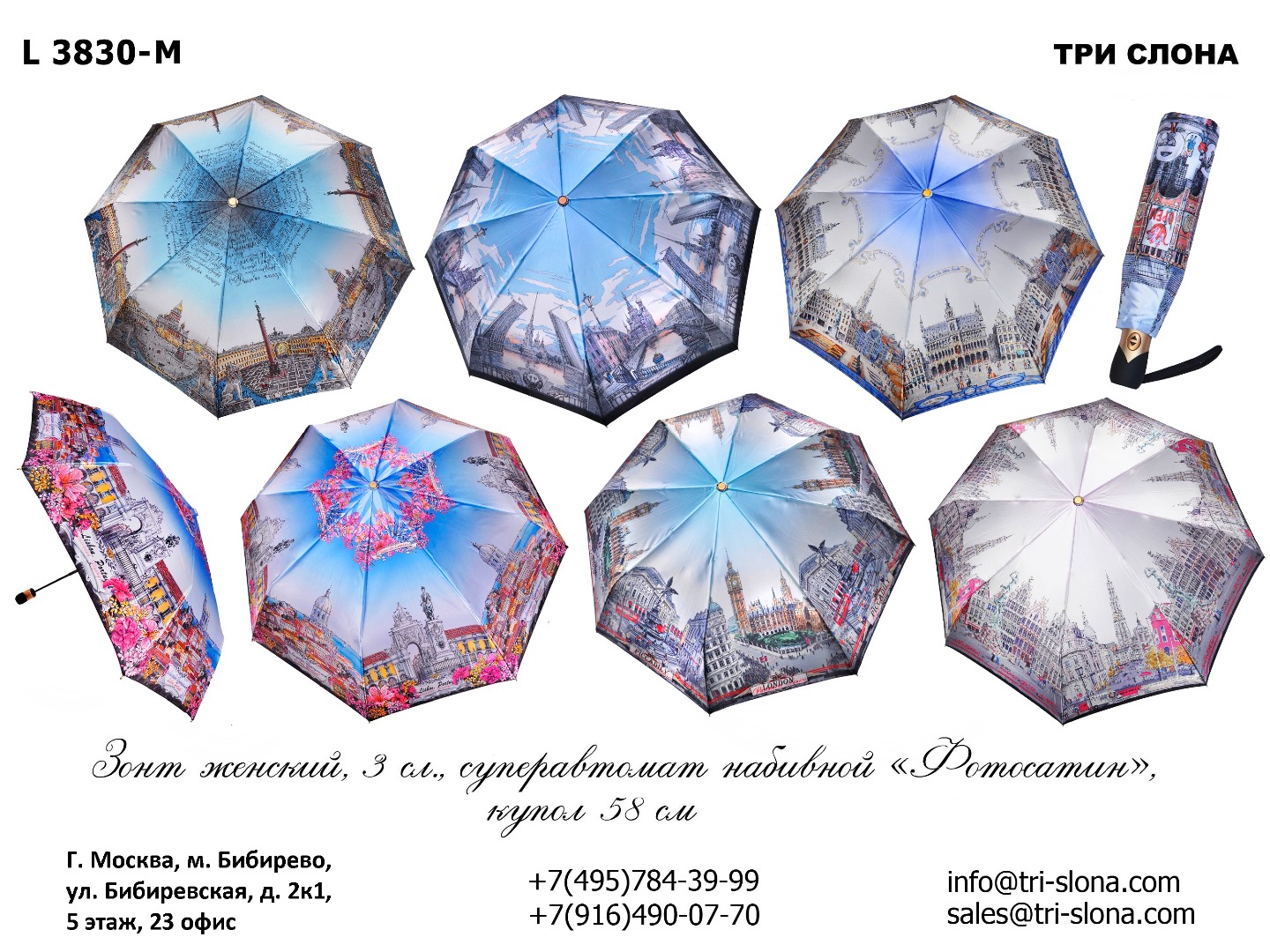 Зонт 3 сложения, Суперавтомат, облегченный, женский набивной "ФОТОСАТИН", 8 спиц, радиус купола - 58 см