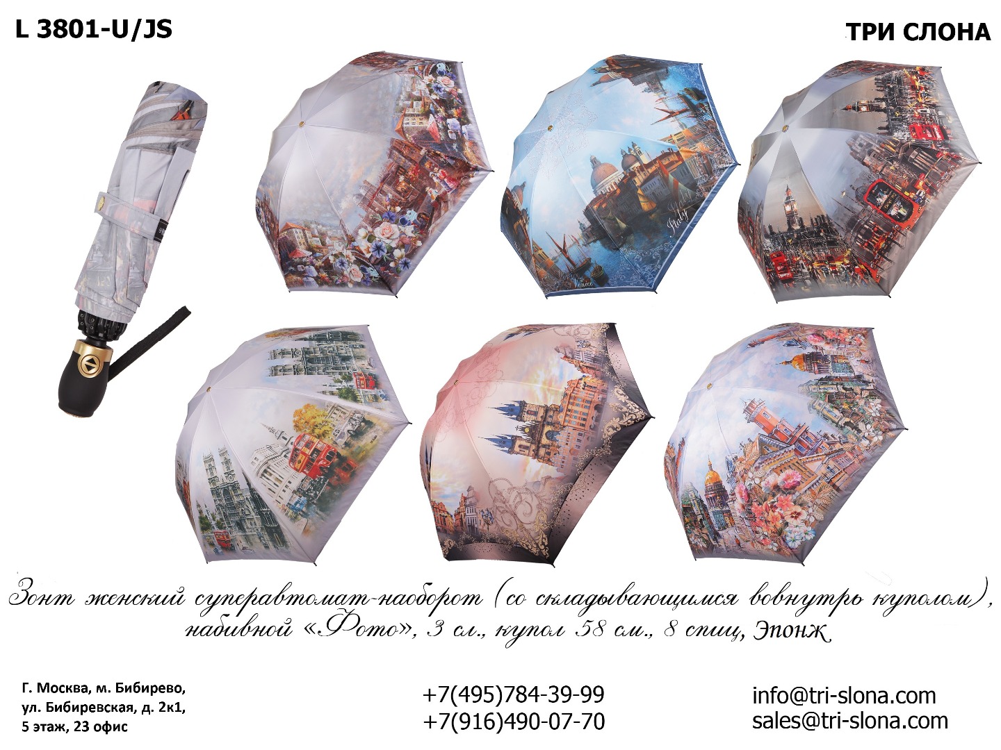 Зонт 3 сложения,суперавтомат-наоборот (со складывающимся вовнутрь куполом), женский,облегчённый,набивной "Эпонж",8 спиц,радиус-58