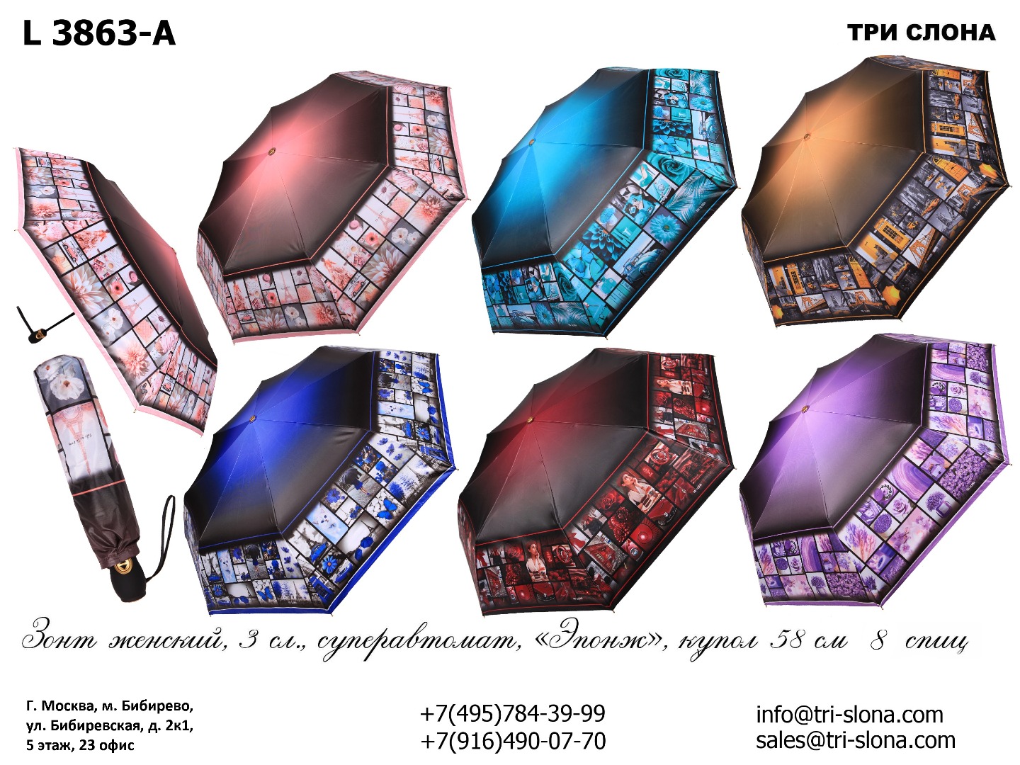 Зонт 3 сложения, Суперавтомат, женский набивной "ЭПОНЖ" , 8 спиц, радиус купола - 58 см